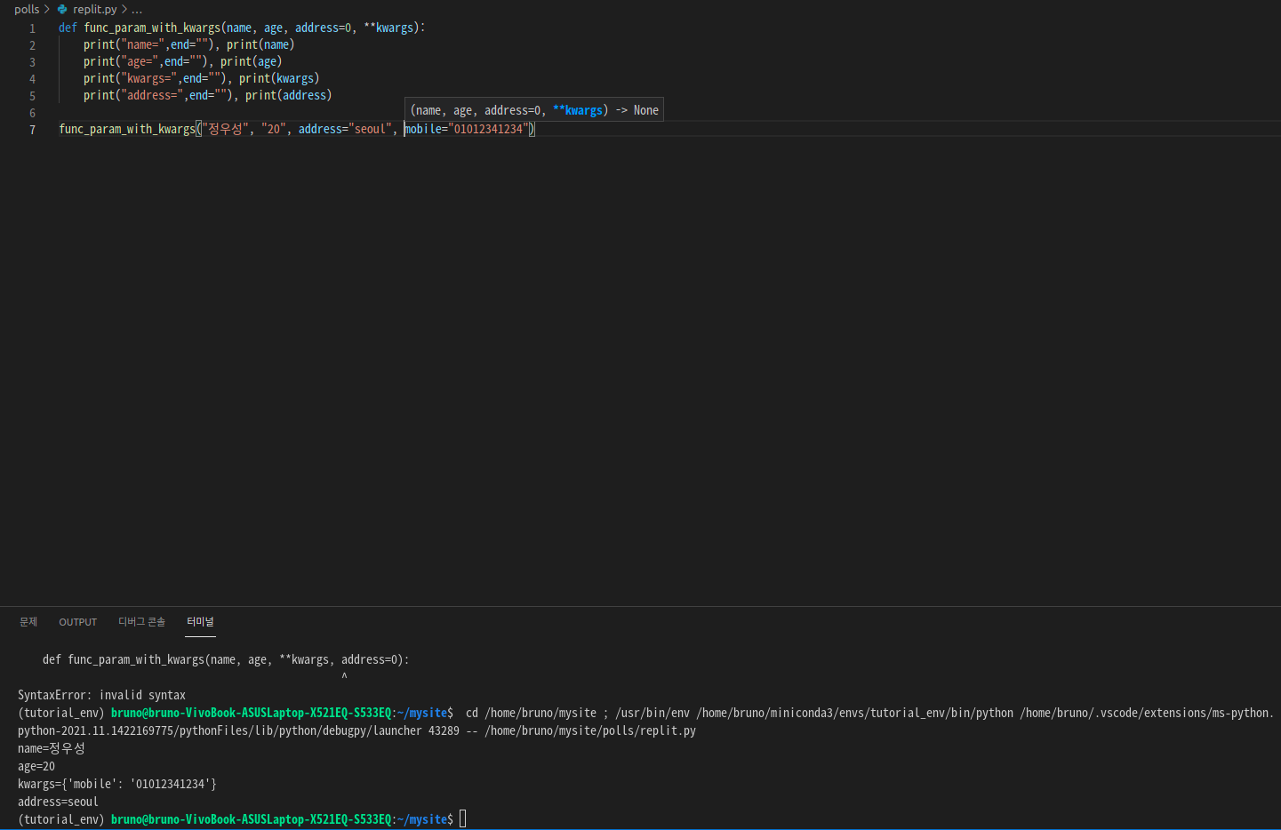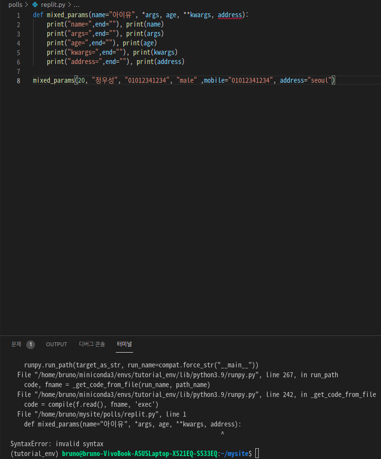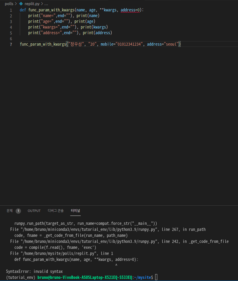 해결 방법 : 함수 호출하는 부분에 age에 값 지정하여 해결! 2. 가변 키워드 인수 (variable length keyword arguments)의 위치를 참고 자료를 통해 조사해서 어떤 에러가 발생 하는지 확인하고, 에러를 고쳐 정상적으로 출력하기!