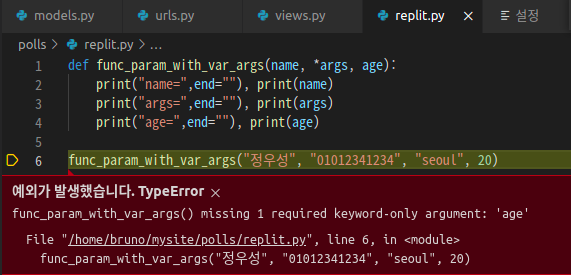 TypeError : 'age'에 keyword-only argument 입력이 필요합니다 라는 메세지입니다.