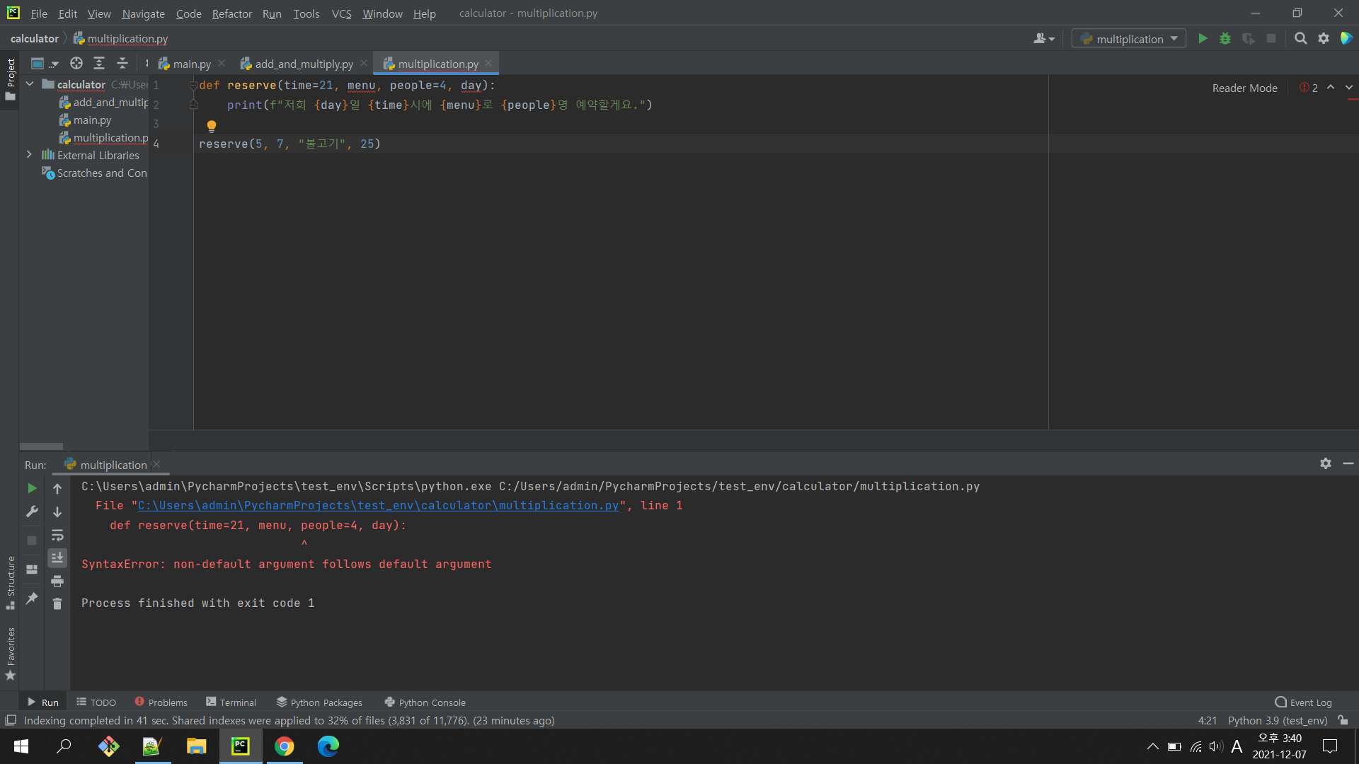 함수 선언(생성) 부분에 default value argument가 non-default value argument보다 앞에 온 것이 잘못된 부분이다. 1. 위치 인수(positional arguments)와 가변 인수(variable length arguments)의 위치를 참고 자료를 통해 조사해서 어떤 에러가 발생 하는지 확인하고, 에러를 고쳐 정상적으로 출력하기!